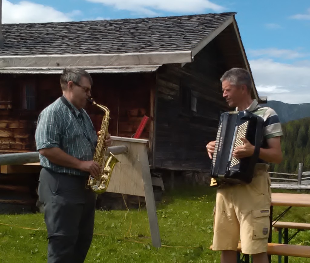 Wir unterhielten die Gäste, Wanderer und Biker mit einem vielseitigen Programm in zwei Blocks. Zwischendurch machte die Kleinformation mit Josef an der Handorgel Tanzlmusik, die Horni und der Bass führten ein Alphornstück auf, die 2 kleinen und die 2 grossen Bleche spielten Weisen und 3 Klarinetten gaben ebenfalls einige Stücke, die sie extra für die Alp geübt hatten, zum Besten. Auch Josef und seine Frau Angelika unterhielten mit zwei Gesangsstücken, begleitet mit der Handorgel. Selten sassen die Musikanten alle beisammen am Tisch auf der Terrasse, es gab immer wieder jemanden, den es in den Fingern juckte, der unbedingt noch musizieren wollte.