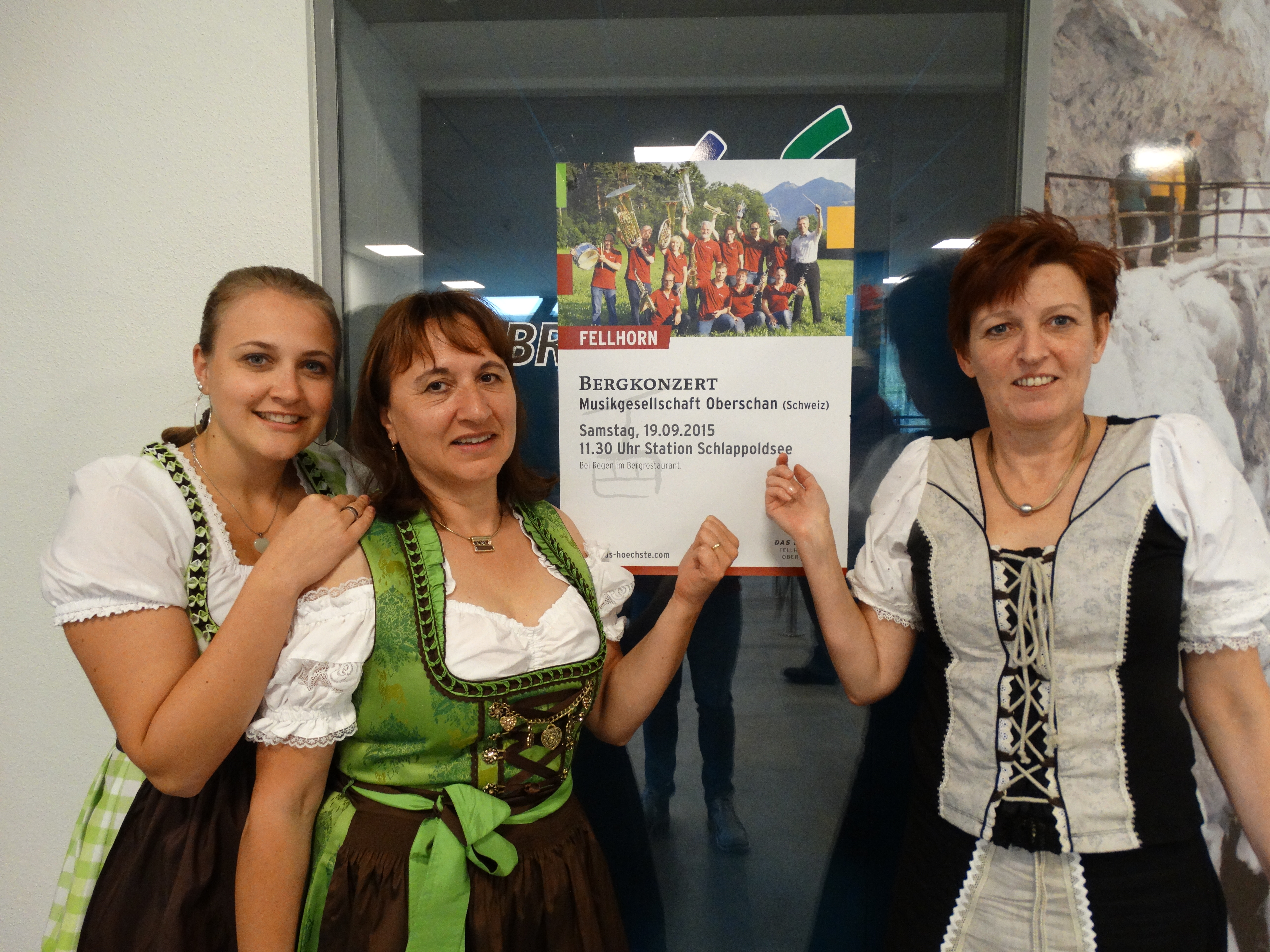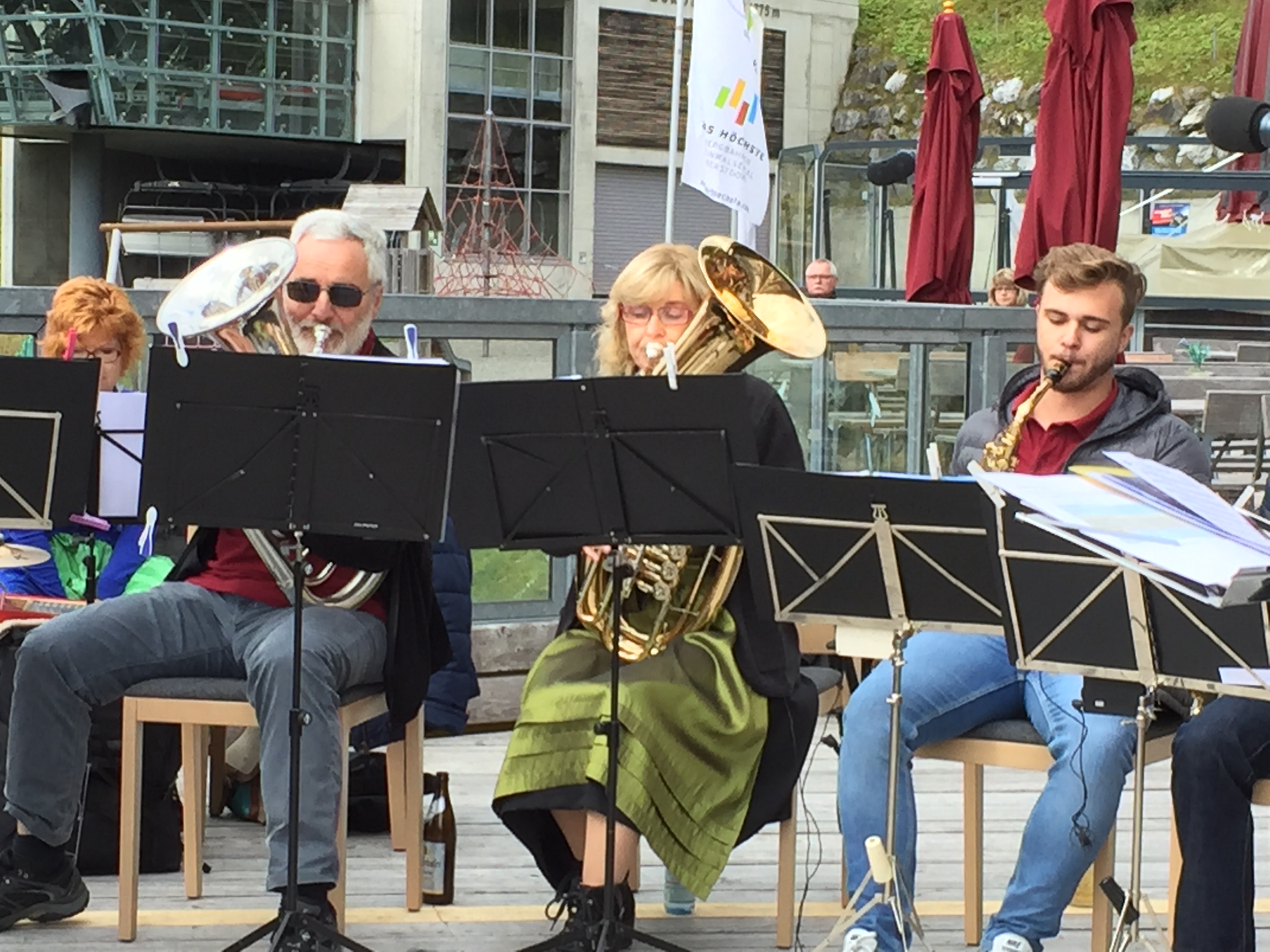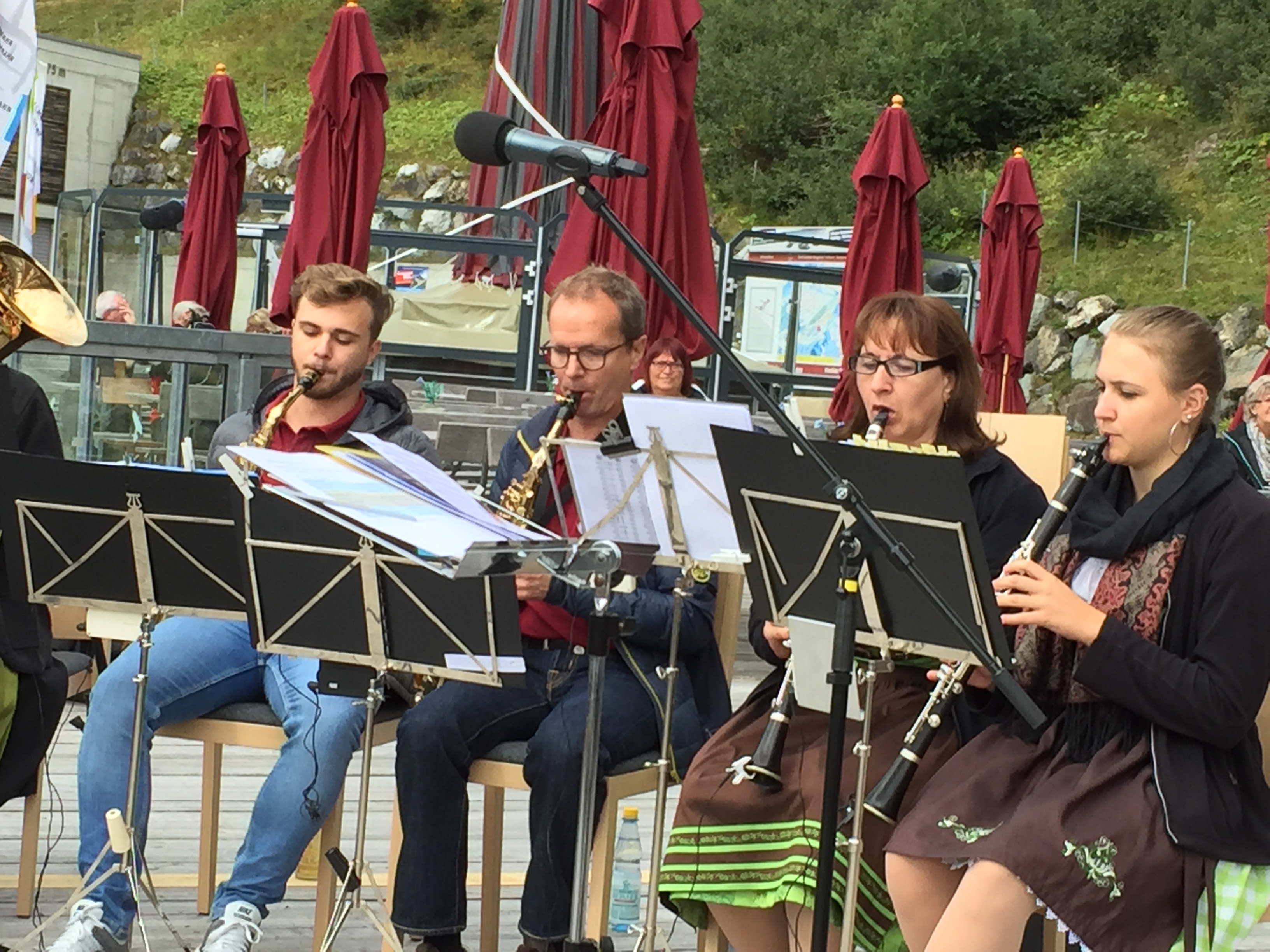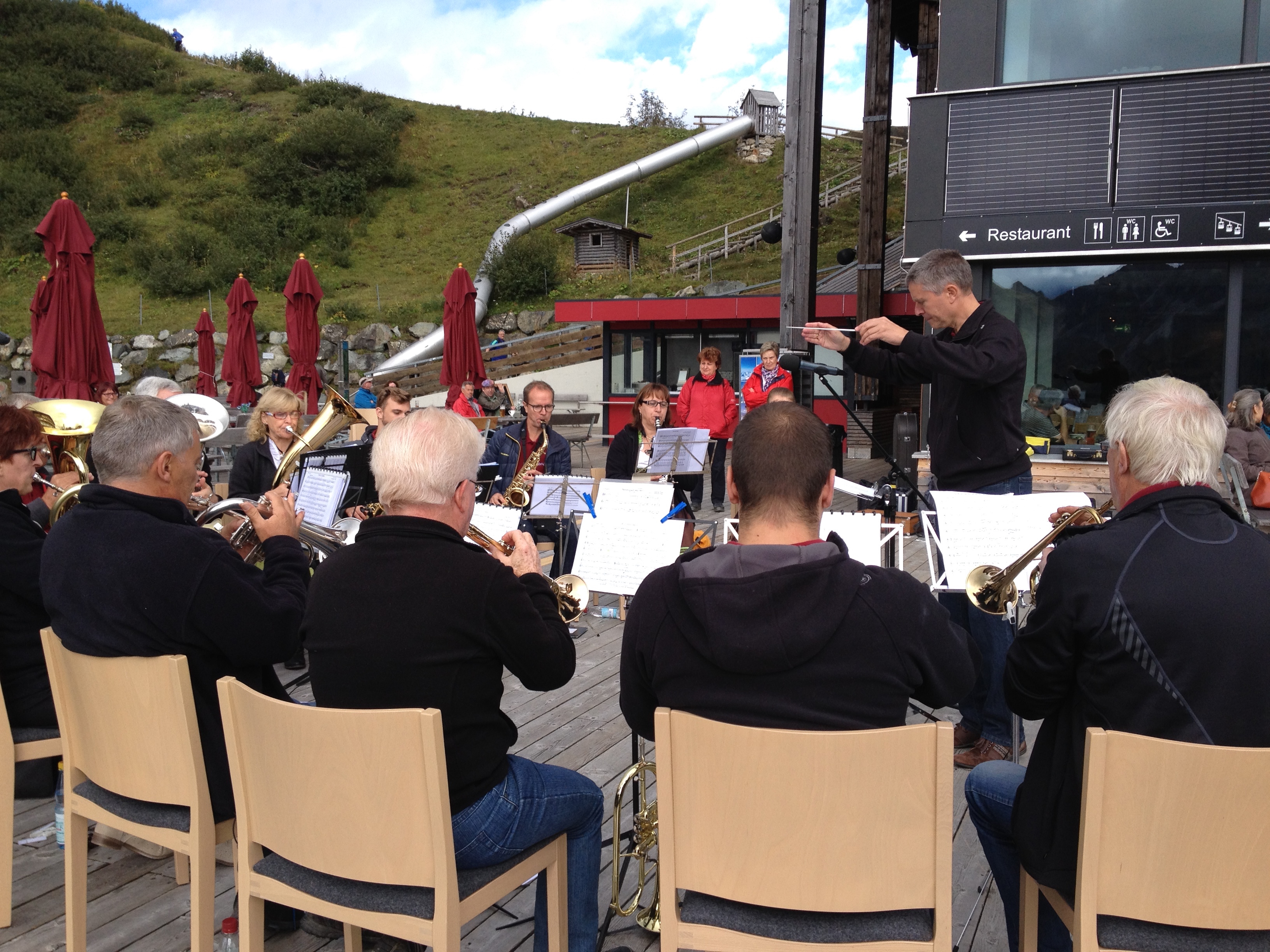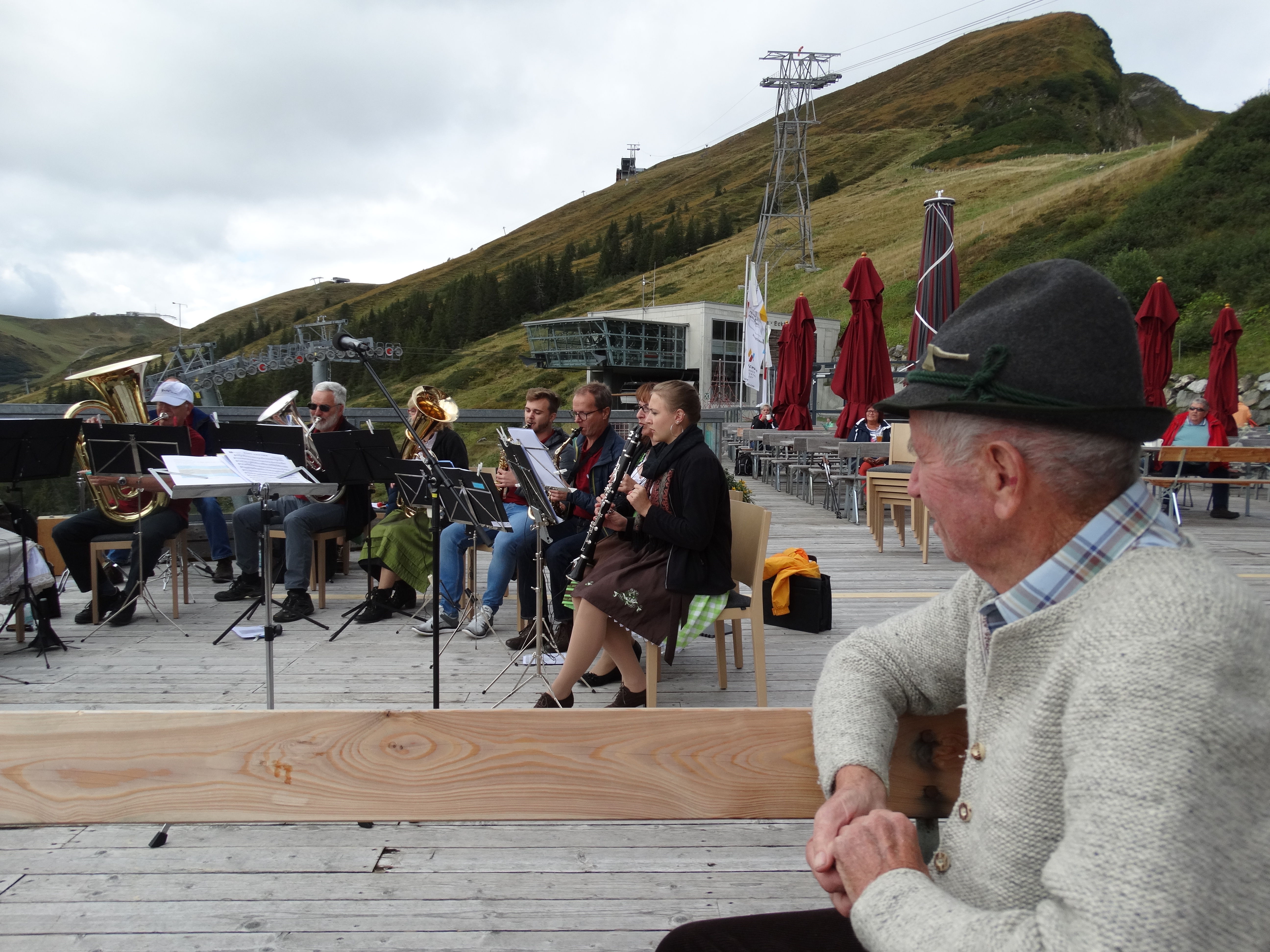 Ein schwungvolles Konzert mit der Musikgesellschaft Oberschan wurde auf der Homepage und den ausgehängten Plakaten der Fellhornbahn in Aussicht gestellt. Das wurde es dann auch. Wir Musikanten, unsere Reisebegleiter und die trotz unsicherer Wetterprognose stattliche Anzahl Zuhörer waren begeistert. Es herrschte eine schöne Stimmung. Auch wenn schon die eine oder andere Kapuze hochgezogen wurde, hörten die Gäste auf der Terrasse bis zum Schluss aufmerksam zu.