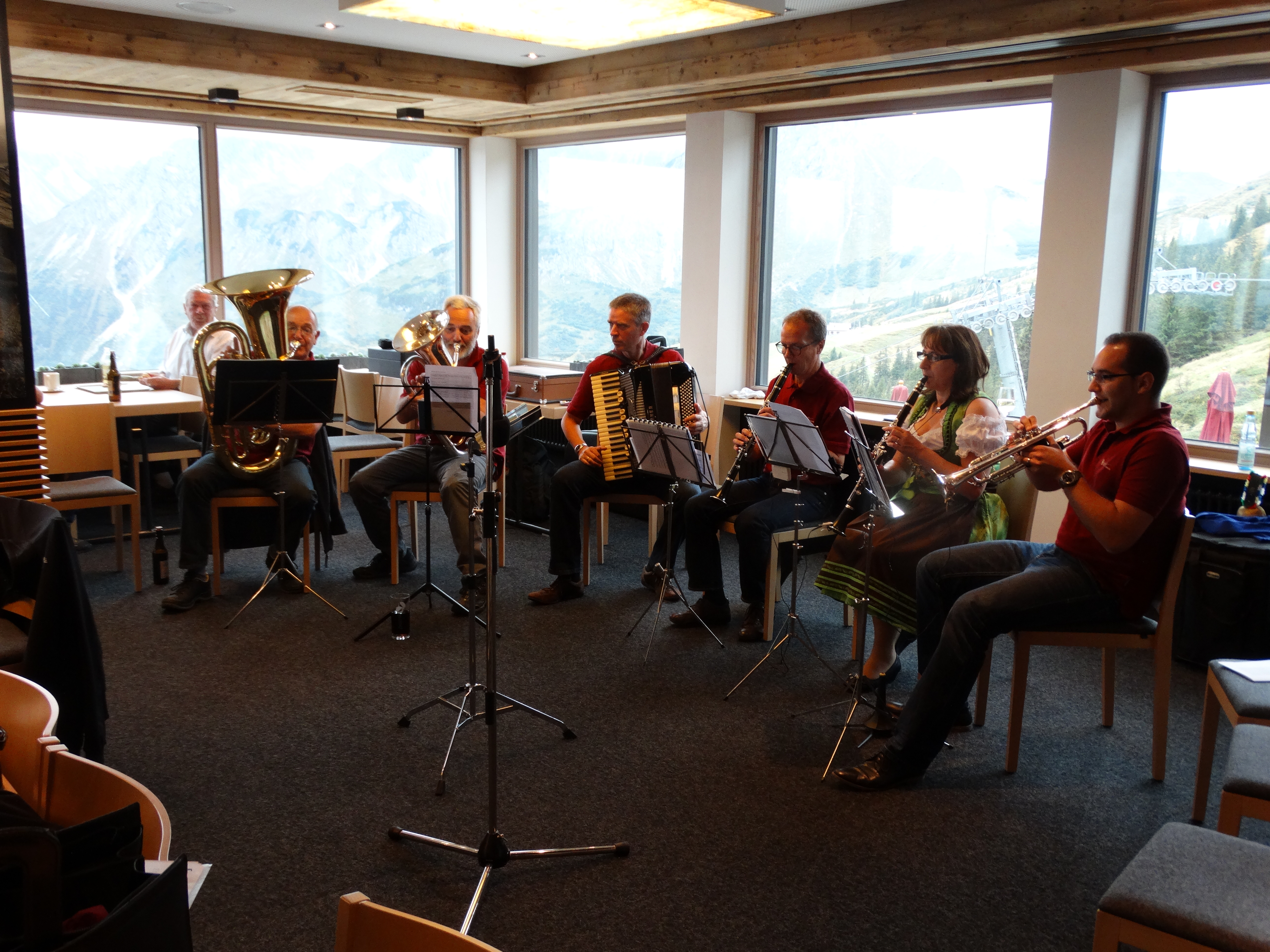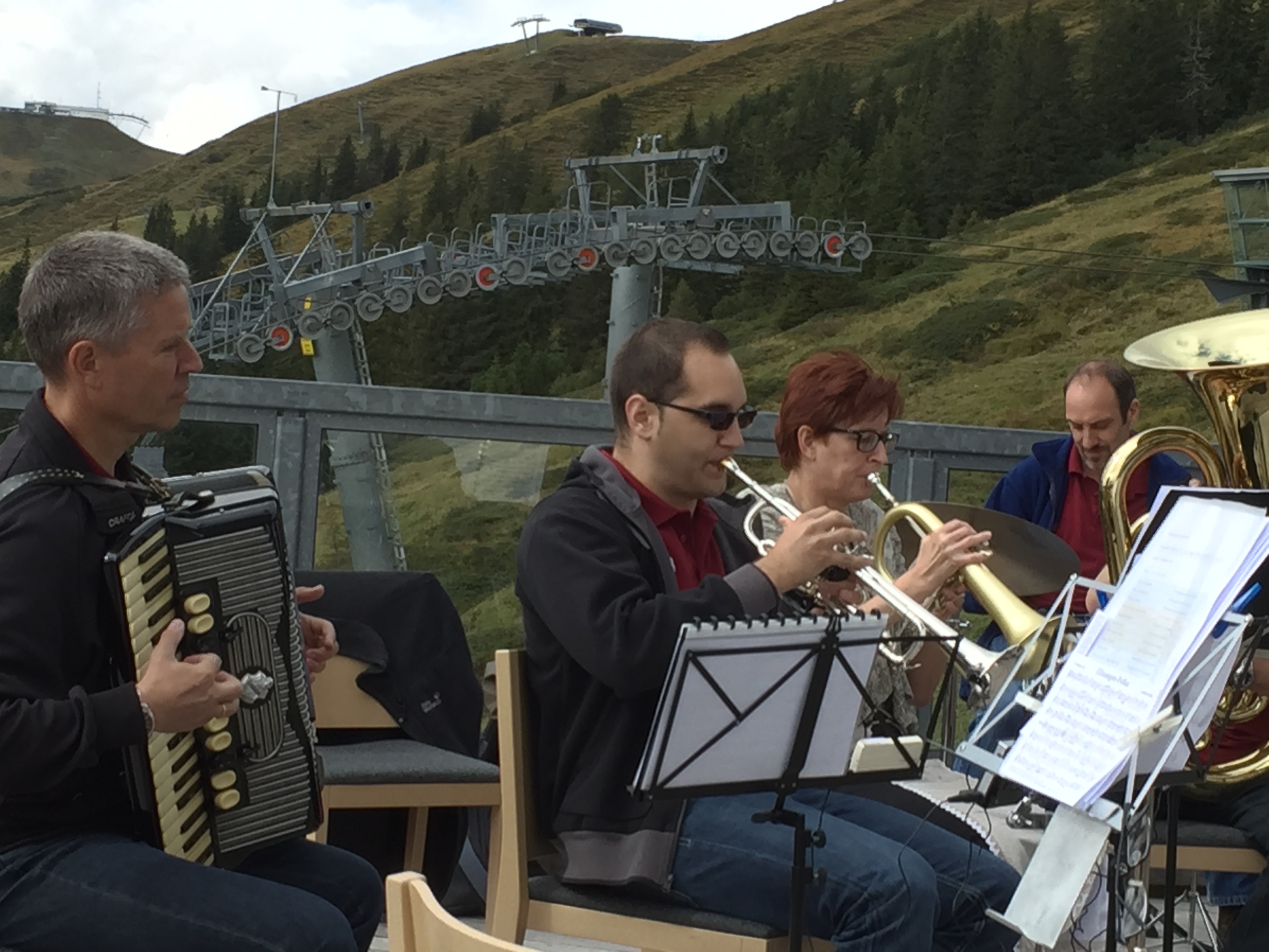 Auf ca. 1700 m Höhe wurden wir freundlich empfangen von den Wirtsleuten und unserem Dirigenten sowie von Zuhörern, die schon gespannt auf unseren Auftritt warteten.