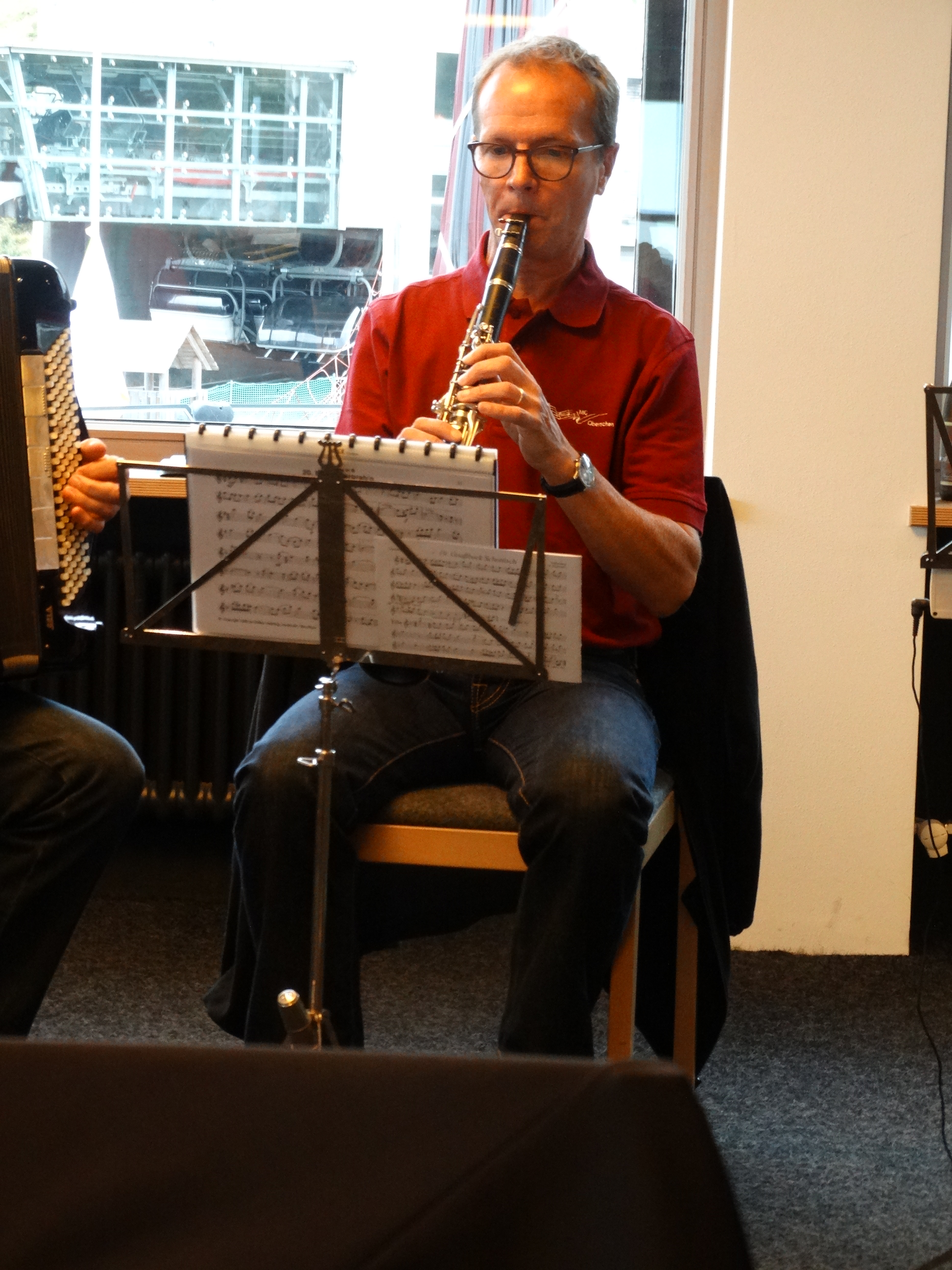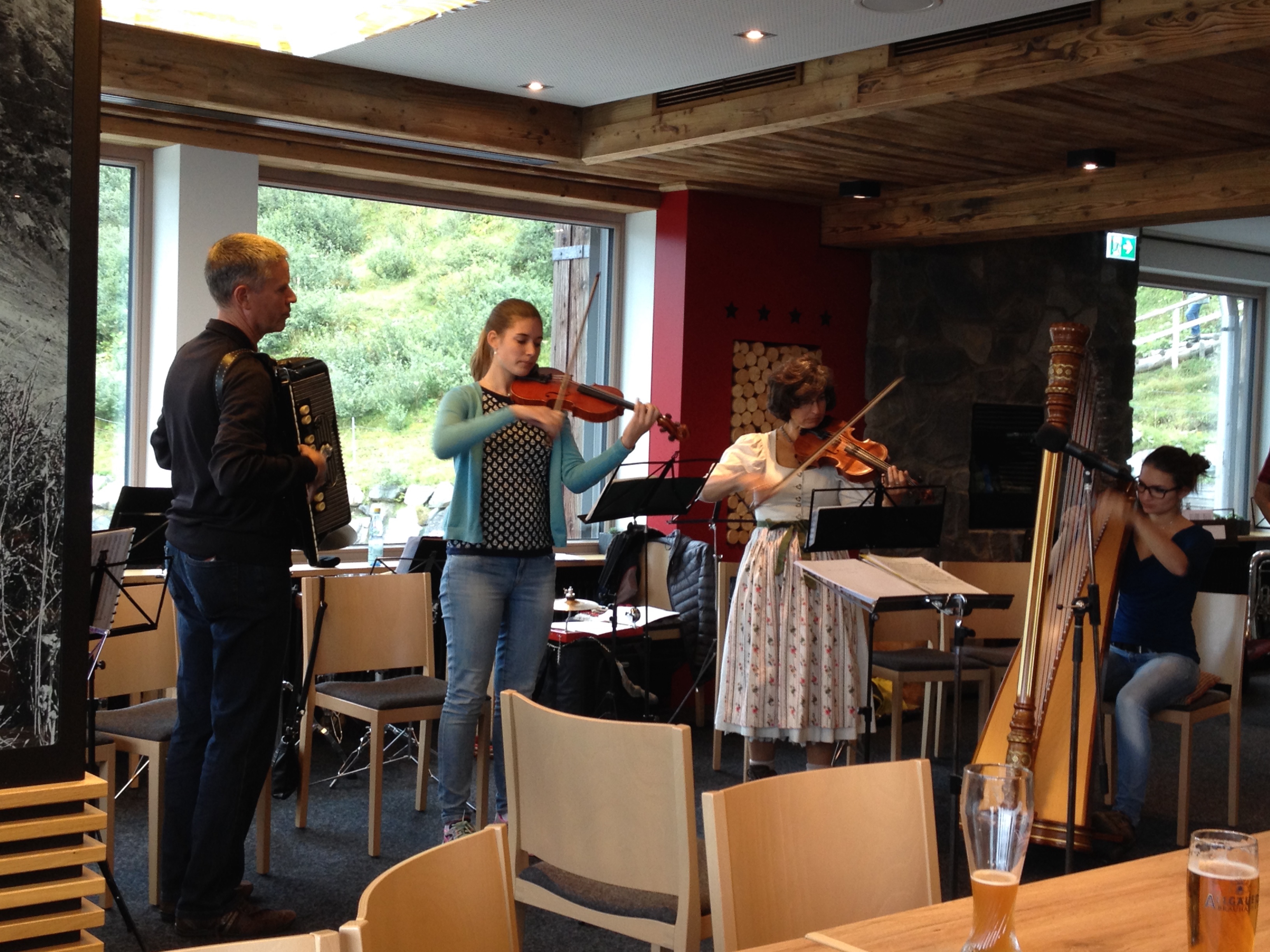 Nach dem Mittagessen wurde es zu kühl, um weiter im Freien zu musizieren. Unser Programm setzten wir im Restaurant fort, wohin die Gäste dann ebenfalls dislozierten. Im Laufe des Nachmittages stiess noch weiteres interessiertes Publikum dazu.