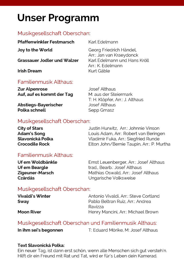 Von der Musikgesellschaft Oberschan wurden Walzer, Polka, Märsche, Jodel, Pop-Songs und «Memory» aus Cats mit Gesang von Katharina Althaus zum Besten gegeben. Als Highlight betrachteten wir Bohemian Rhapsody von Freddie Mercury Der Applaus war grandios. Die Familienmusik Althaus spielte einen Teil ihres grossen Repertoires, Instrumentalmusik und Gesang auf dem Gebiet der traditionellen alpenländischen Volksmusik. Viele der Stücke wurden von Josef Althaus selbst komponiert oder arrangiert. Die instrumentale Vielfalt und der starke musikalische Ausdruck sind das Markenzeichen der Musikerfamilie. Die Familienmusik Althaus ist bekannt aus TV und Radio.