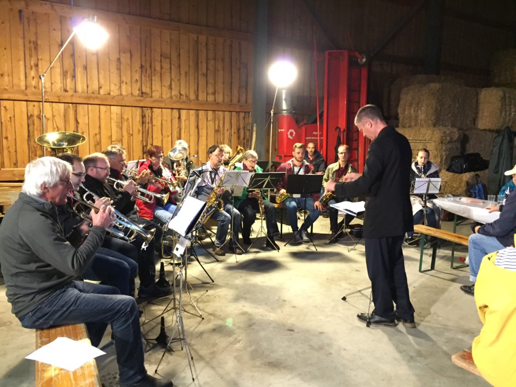 Wir spielten flotte Polkas, Marsch und Walzer, einige modernere Stücke, ein Beach Boys Medley und auch den Louenen See. Das Repertoire kam gut an bei den Zuhörern. In den beiden Pausen spielte die Kleinformation der MGO. Die Darbietungen dieser Formation erhielten ebenfalls grossen Applaus. Die Stimmung im Schuppen war gut, ein gemütliches Ambiente zwischen Strohballen und Maschinenpark. Es war ein gemütlicher geselliger Abend.